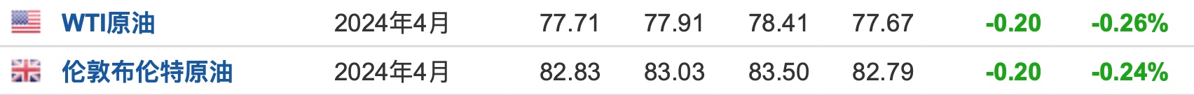3.截至发稿,WTI原油跌0.26%,报77.71美元/桶。布伦特原油跌0.24%,报82.83美元/桶。