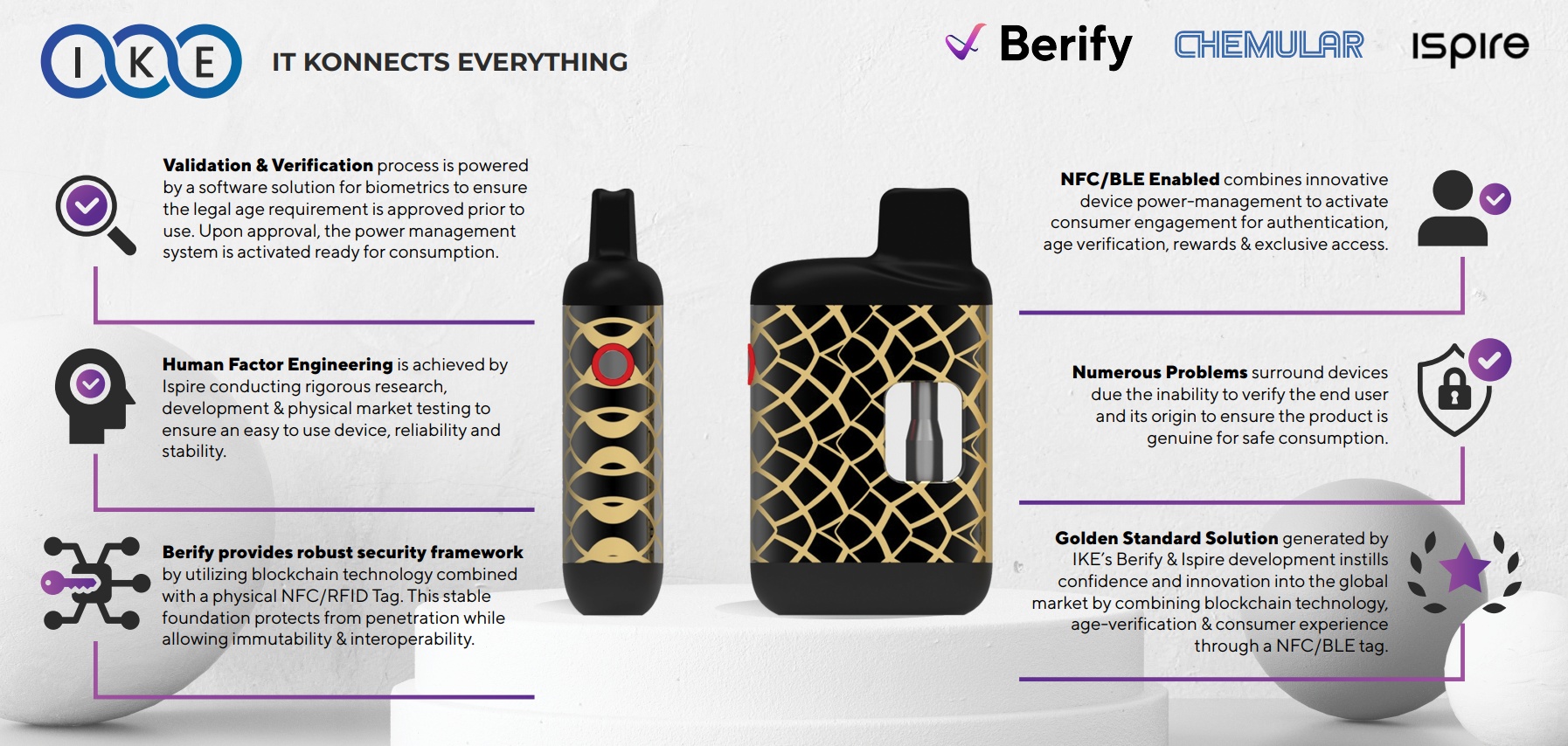 Chemular首席执行官Kevin Burd补充道, “我们的承诺不仅是创造下一代雾化设备,还包括提升市场教育。这项合资还包括建立更多的合作伙伴关系,将整合生物识别身份和访问控制,确保在制造的过程中将解决方案嵌入道雾化设备中,并为消费者提供安全保障和隐私保护。此举是我们积极致力于塑造雾化硬件创新未来的证明。”