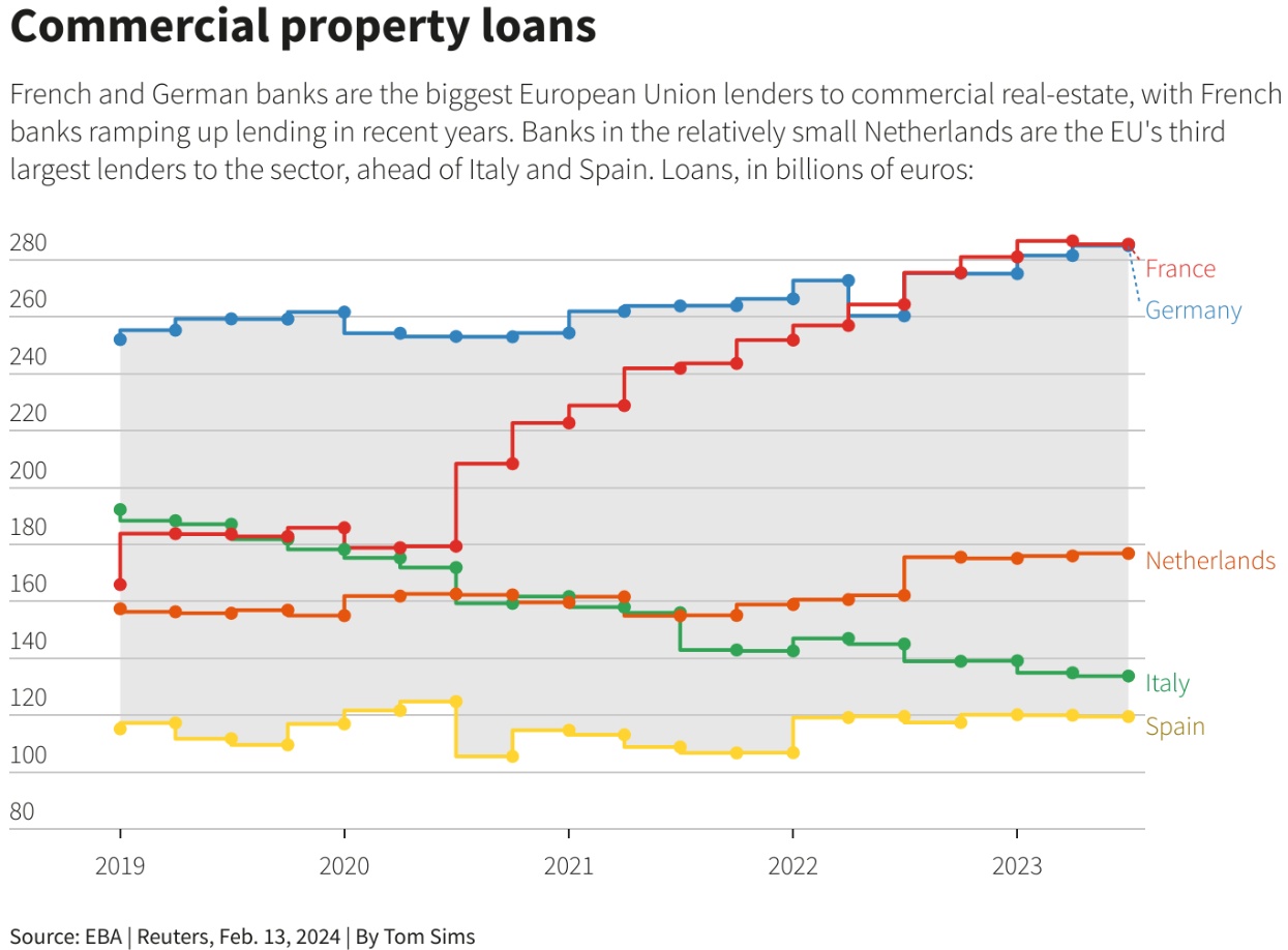 欧洲银行对商业地产行业的贷款约为1.4万亿欧元,其中德国、法国和荷兰的银行对该行业的敞口最大。
