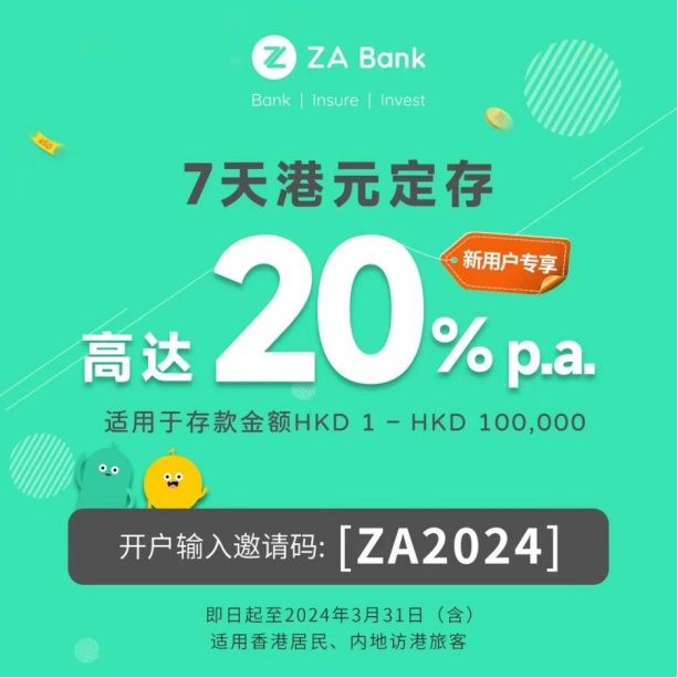 以香港第一数字银行众安银行(ZA Bank)为例,最新的7天港元定存利率,可高达20%,就是存10万港币,7天利息384港币。