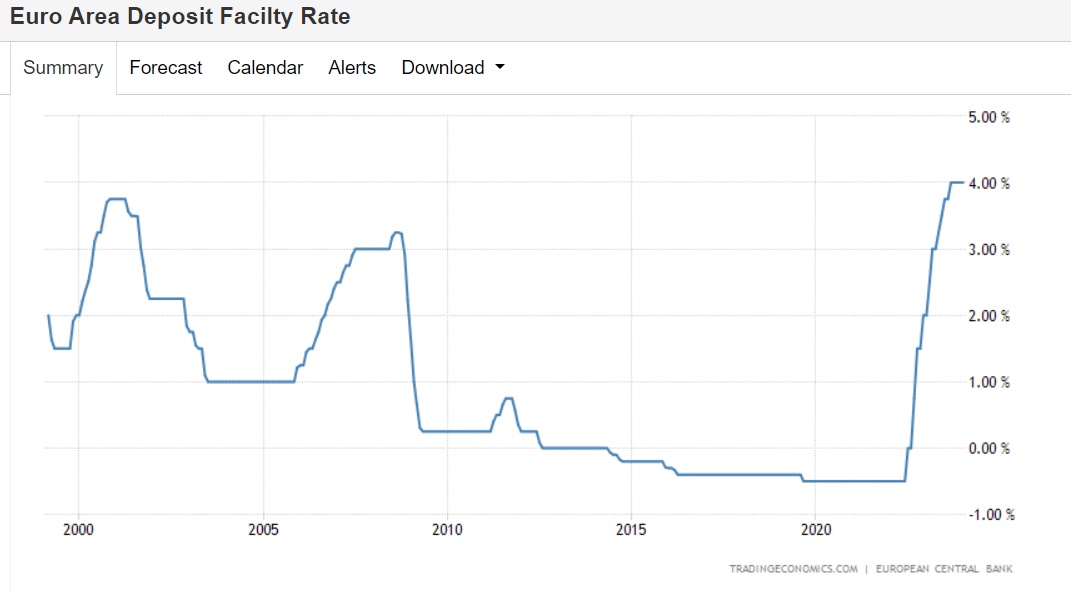据了解,在2022年7月至2023年9月期间,欧洲央行将基准存款利率从负利率上调至创纪录的4%,以应对新冠疫情(Covid-19)大流行后的欧洲通胀飙升之势,以及俄乌冲突后失去俄罗斯廉价能源供应导致的史无前例能源通胀。