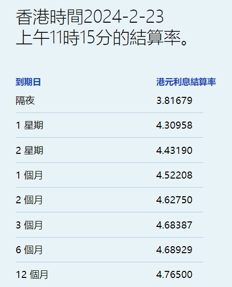 智通财经APP获悉,2月23日,港元拆息亦全线下跌。其中,隔夜息跌约19基点,失守4%,低见3.81679%,创四周新低。