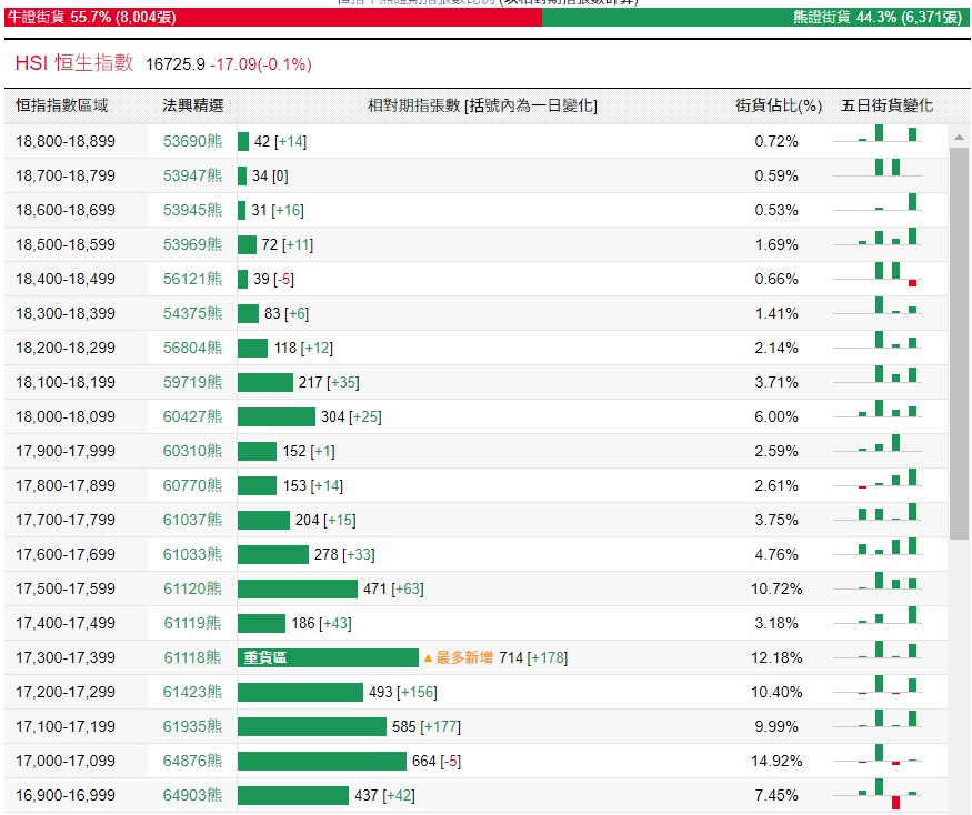 法兴恒指牛熊证街货分布图中的数据显示,熊证街货重货区与最多新增均在17300-17399区间,该区间最新熊证数量为714张,较上一交易日增加178张。