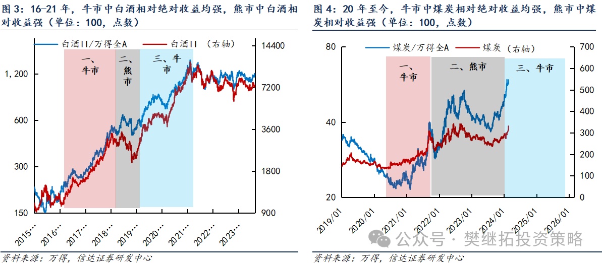 (2)以牛熊市划分白酒和煤炭牛市三阶段。如果以整体指数的牛熊市来划分,2016-2021年的白酒牛市可以划分成三个阶段。第一个阶段2016-2017,经济回升,股市慢牛,白酒相对和绝对收益均很大。第二个阶段2018年,经济下行,股市熊市,白酒相对收益很多,有小幅绝对收益。第三个阶段,2019-2021年,熊市结束,再次进入牛市,经济晚些再次进入新一轮回升,白酒相对和绝对收益增长速度再次扩大。这三个阶段最近几年也出现在了煤炭行业,2020-2021是第一个阶段,市场牛市,煤炭绝对和相对收益均很强,2022-2023年的第二个阶段,市场熊市,煤炭超额收益很强,绝对收益因为中间经历过2022年Q4-2023年Q2的回撤,所以有些波折,但整体好于大部分板块,2024年2月开始进入第三个阶段,市场底部反转,这有可能开启新一轮牛熊周期,煤炭继续跑赢。