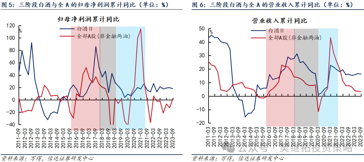 (3)穿越牛熊三阶段的财务指标。从白酒和全A财务指标的对比来看,这三个阶段的特征差异较为明显。第一个阶段(16-17年)白酒利润增速和收入增速均很高,增速的环比持续抬升,而且比全A增速水平高,见顶时间晚。第二个阶段(18年),虽然白酒增速高,但增速水平已经开始明显下降,但是下降的速度比之前2012-2013年的周期缓和很多,ROE还是维持高位。第三个阶段(19-21年),伴随经济和全A盈利增速企稳,白酒利润和收入增速在稍低的水平稳住。