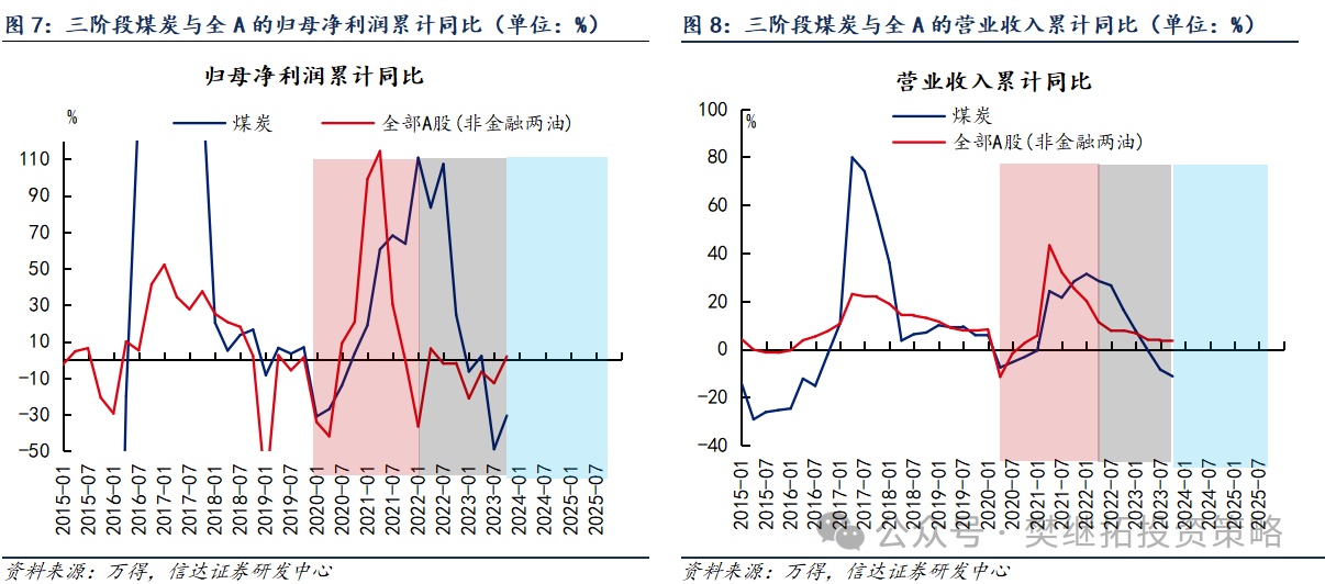 煤炭行业从财务指标上看,刚经历过前面两个阶段。第一个阶段(20-21年)煤炭利润增速和收入增速均很高,增速的环比持续抬升,而且比全A增速水平高,见顶时间晚。第二个阶段(22-23年),由于需求下滑,供给保供应,价格高位回撤,利润增速明显回落,但价格回落幅度比之前经济下行期小很多,ROE还能继续维持高位。