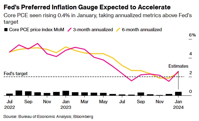 智通财经APP获悉,备受关注的美国1月PCE物价指数数据将于周四晚公布。这项美联储青睐的通胀指标预计将突显出美联储遏制价格压力的道路漫长而坎坷。市场目前预计,剔除食品和能源成本的美国1月核心PCE物价指数将环比上升0.4%,这标志着该指标连续第二个月加速增长,而过去两年该指标基本上一直在回落。如果以三个月或六个月为基础将数据折合成年率,美联储青睐的通胀指标将在去年12月跌破2%之后重新反弹至该目标水平上方。