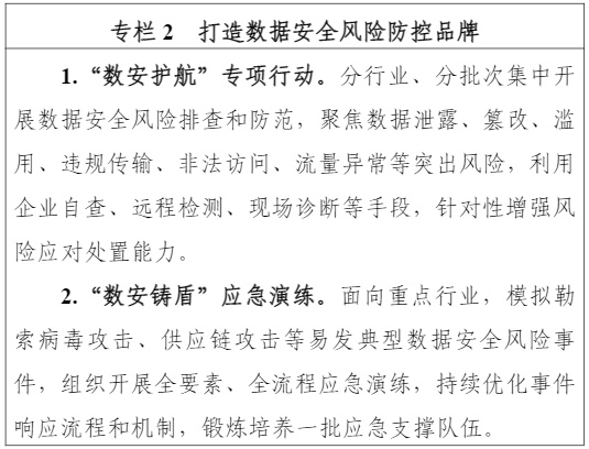 6.加强数据安全风险防控。完善工业领域数据安全风险信息报送与共享工作机制,组建数据安全风险分析专家组,动态管理风险直报单位库,协同加强地方力量,常态化开展风险监测、报送、预警、处置等工作。摸排数据安全风险事件特点和规律,建立重大风险事件案例库,加强案例剖析和风险提示。面向重点行业开展“数安护航”专项行动,定期组织“数安铸盾”应急演练,提升事件快速反应、规范处置、协同联动水平。