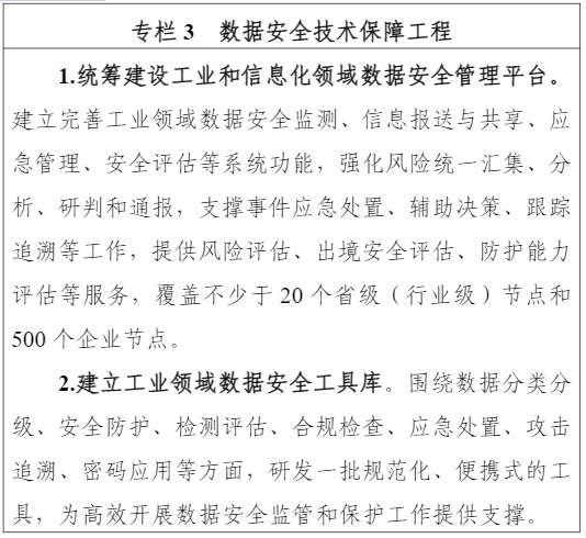 7.推进数据安全技术手段建设。统筹建设工业和信息化领域数据安全管理平台,建立工业领域数据安全工具库,形成集数据资源管理、态势感知、风险信息报送与共享、技术测试验证、事件应急响应等功能于一体的技术能力,加强与网络安全技术、密码技术手段协同。推动有条件的地方、行业、企业等加快建立数据安全风险监测与应急处置等技术手段,强化“部-省-企业”技术能力三级联动,不断提升技术保障水平。