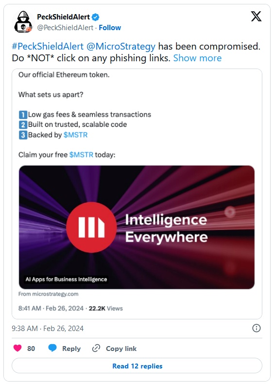 该贴子促使安全公司PeckShield发出警告,称MicroStrategy在X上的账户已被入侵。另一名绰号为ZachXBT的加密侦探则表示,黑客能够从被蒙骗的用户那里窃取约44万美元。