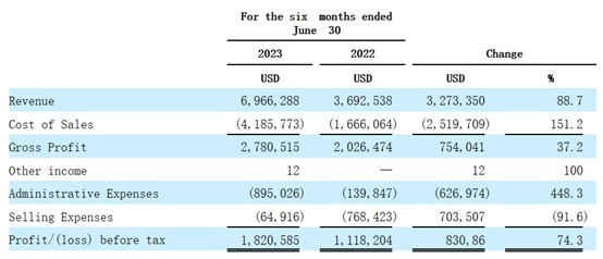 招股书显示,该公司的营收可谓是获得了弥足的增长:由截至2022年度的1.96万美元大幅增长至2022年12月31日止年度的约850万美元,增长433倍。同时,该公司亦从2021年的1.69万美元税前亏损扭亏为盈,2022年实现约230万美元税前利润。