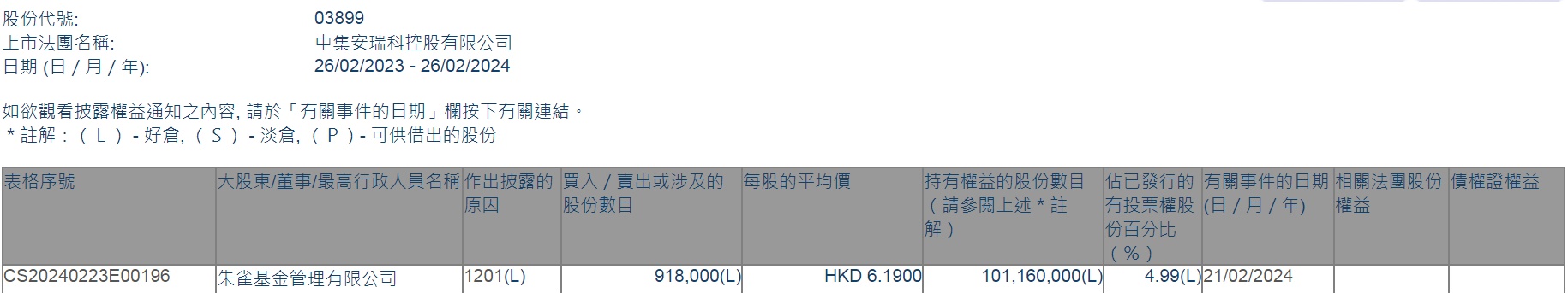 智通财经APP获悉,香港联交所最新资料显示,2月21日,朱雀基金管理有限公司减持中集安瑞科(03899)91.8万股,每股作价6.19港元,总金额约为568.24万港元。减持后最新持股数目约为1.01亿股,最新持股比例为4.99%。
