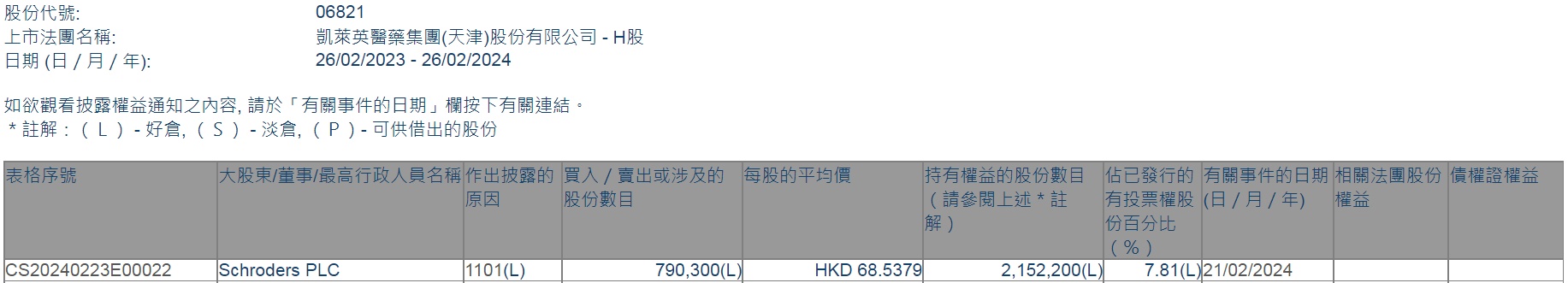 智通财经APP获悉,香港联交所最新资料显示,2月21日,Schroders PLC增持凯莱英(06821)79.03万股,每股作价68.5379港元,总金额约5416.55万港元。增持后最新持股数目约为215.22万股,最新持股比例为7.81%。