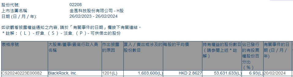 智通财经APP获悉,香港联交所最新资料显示,2月20日,贝莱德减持金风科技(02208)160.36万股,每股作价2.8627港元,总金额约为459.06万港元。减持后最新持股数目约为5363.16万股,最新持股比例为6.93%。
