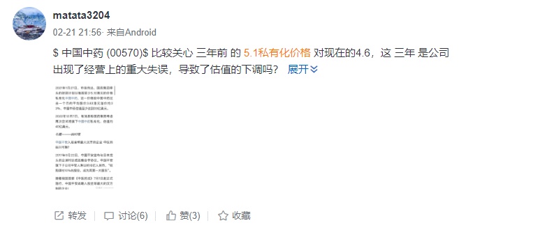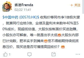 根据智通财经APP了解,关于中国中药港股市场“最后一舞”,股民并不满意,不满的点主要集中在私有化的低价方面。雪球上有投资者直言“公司私有化价格太低,目前港股历史低点+前期无任何利空暴跌20%,拉低股价,大股东有趁火打劫之嫌。”