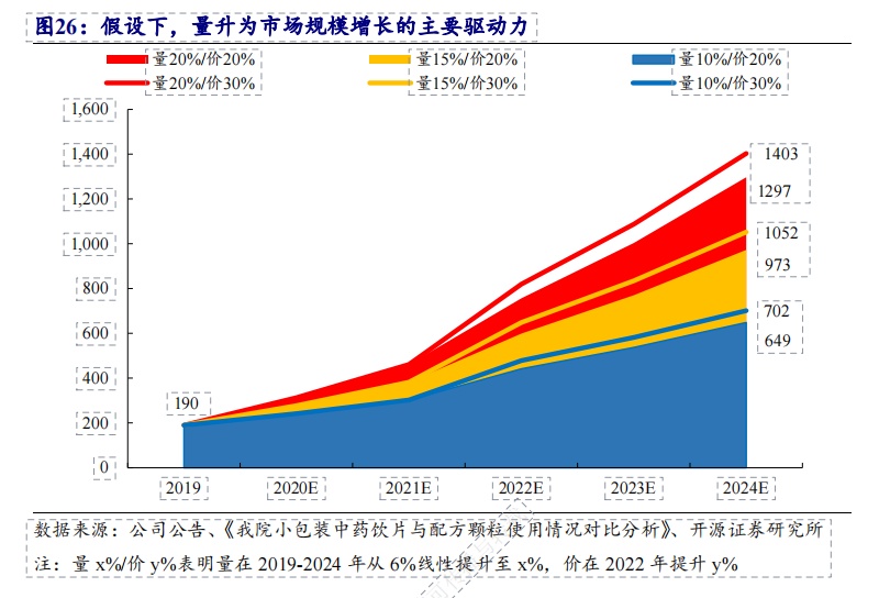 此外,随着中药配方颗粒集采落地,中国中药或将迎来新的发展机遇。集采之下,销售范围拓宽带来量的增长,有利于成本控制较好的全产业链公司。中国中药作为行业龙头,将受益于行业销量的快速增长。以开源证券研报数据为例,量升为中药配方颗粒市场规模增长的主要驱动力。比如将2024年量增幅从10%提升15%至15%,对应2022-2024年市场规模会分别增长36%、43%、50%。
