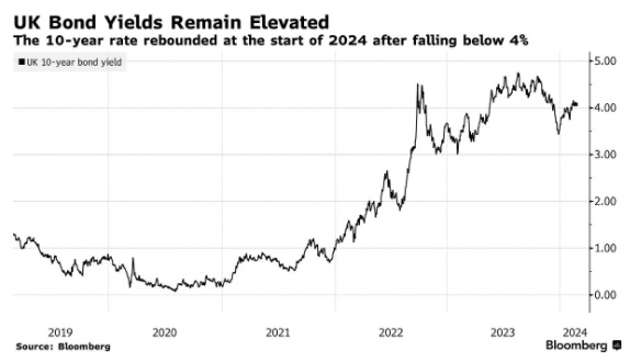 英国国债今年开局不顺,收益率涨幅超过欧洲和美国同类国债,达到4%以上。英国央行行长贝利上周曾表示,市场对今年降息的押注“并非不合理”,但他补充道,何时以及以何种方式放松政策,取决于在应对粘性通胀方面取得的进一步进展。
