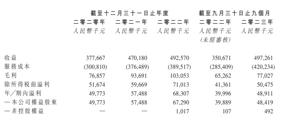 财务方面,于2020年、2021年、2022年以及2023年9月30日止,公司实现总收益分别约为人民币3.78亿元、4.70亿元、4.93亿元、4.97亿元,同期,公司实现年内溢利分别为人民币4977.3万元、5748.8万元、6830.7万元、4891.1万元。