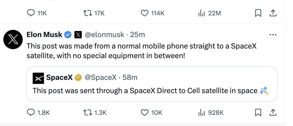 智通财经APP获悉,2月26日,SpaceX在社交平台发文称,这篇文章是通过太空中的SpaceX Direct to Cell卫星发送的。据悉,这是SpaceX通过太空“星链”卫星网络在社交平台上成功发布的第一个帖子。对于这一“里程碑”式成就,马斯克强调,SpaceX的这条消息是从一部普通手机直接发到SpaceX卫星上的,中间没有特殊设备。