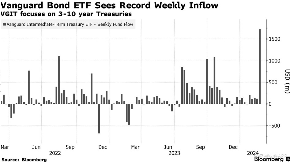 智通财经APP获悉,由于美联储今年大幅降息的希望逐渐减弱,投资者上周以有记录以来最快的速度涌入一只中期美国国债ETF,并从短期债券中撤出。追踪未来3-10年内到期的美国政府债券的先锋中期国债ETF(VGIT)上周吸引17亿美元资金,这是自2009年成立以来最大的单周资金流入。