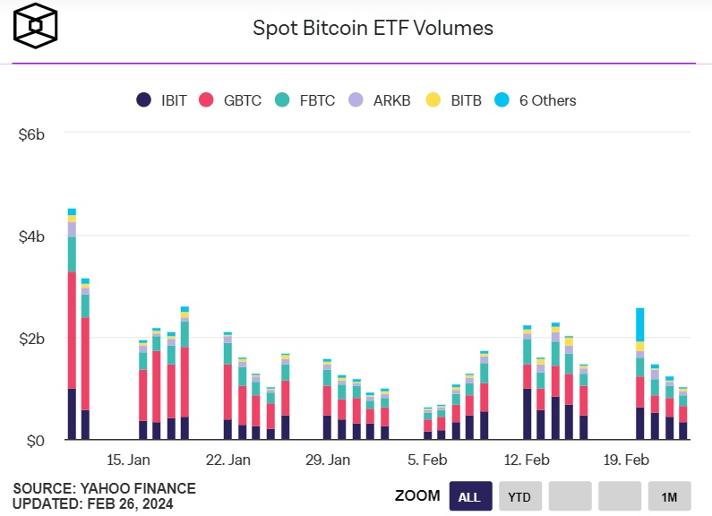 CoinShares的数据显示,截至上周末,包括GrayScale的基金在内,所有现货比特币ETF的累计交易量已接近520亿美元。新产品于1月11日开始交易。
