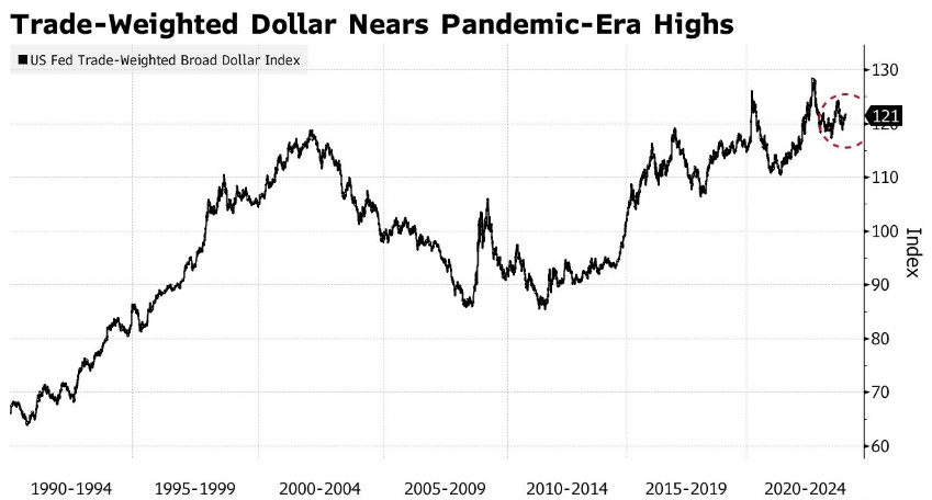 今年美国风险资产的强劲反弹背后有一个潜台词:美元资产是唯一的选择。美元仅略低于疫情期间创下的纪录,有望成为2020年以来表现最好的一年。以美国最大贸易伙伴的货币来衡量,它比过去20年的平均水平高出了17%。