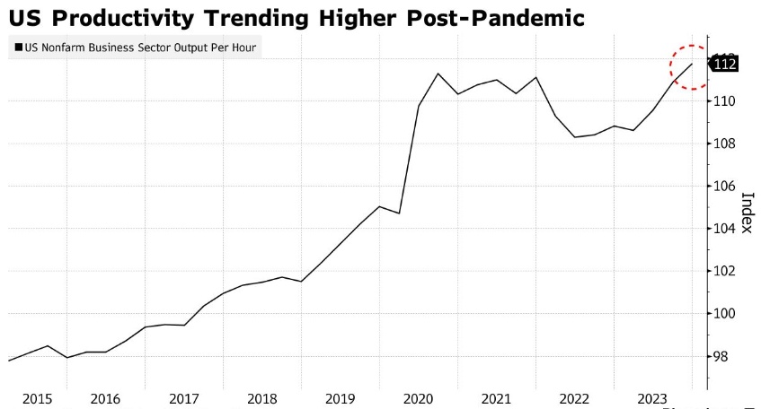 美国正在收获生产率激增的好处——至少目前是这样——这可能使美国经济免受全球经济放缓的影响。而且巴克莱的Fiotakis表示,短期效应仅仅是一个更强大的潜在趋势的前兆。Fiotakis在接受采访时说:“美国一直在投资,并继续在一种主要旨在以被低估的方式提振国内经济的商业模式上加倍下注。”他提到了大宗商品产量的增加和美国大型科技公司的全球影响力。