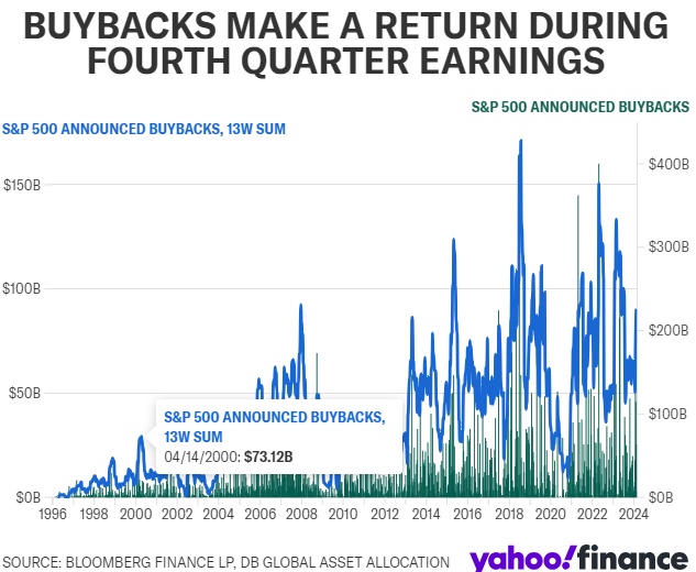 Meta(META.US)、迪士尼(DIS.US)和优步(UBER.US)等公司都宣布了本财报季回购股票的计划。德银的数据显示,公司正在根据这些回购授权采取行动,标准普尔500指数成分股公司在2月的第一周回购了价值630亿美元的股票,这是自2023年5月以来单周回购总额最高的一次。