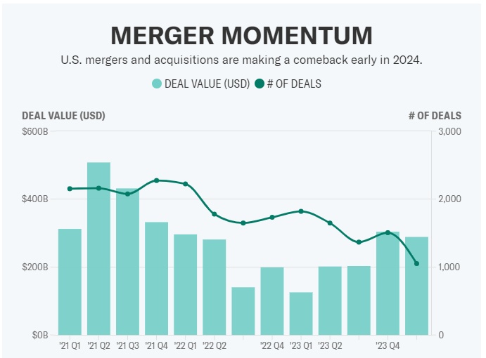 企业信心的另一个迹象是:今年年初,企业支出现金流的另一种方式——交易也有所增加。