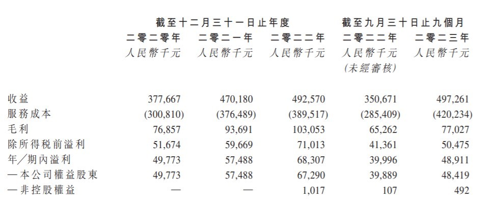 财务方面,于2020年、2021年、2022年以及2023年9月30日止9个月,公司实现总收益分别约为人民币3.78亿元、4.70亿元、4.93亿元、4.97亿元;同期,公司实现年内溢利分别为人民币4977.3万元、5748.8万元、6830.7万元、4891.1万元。