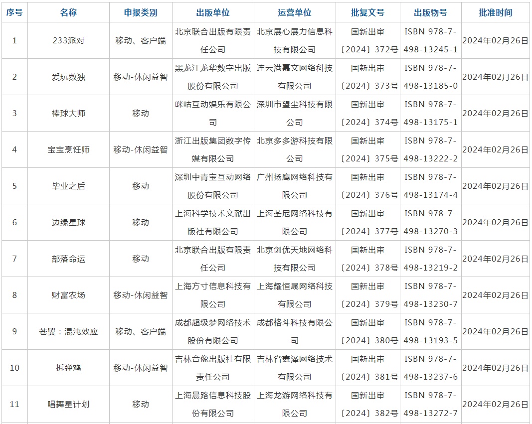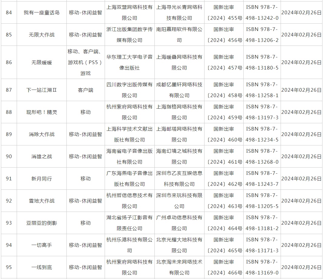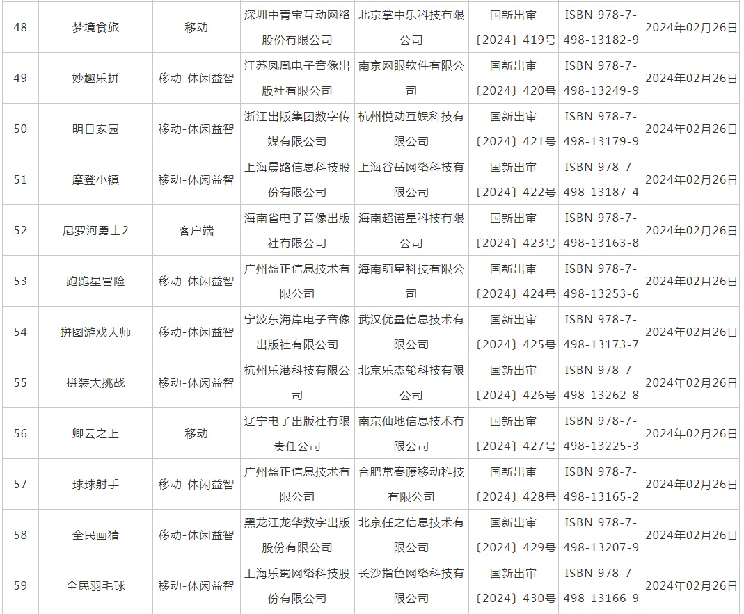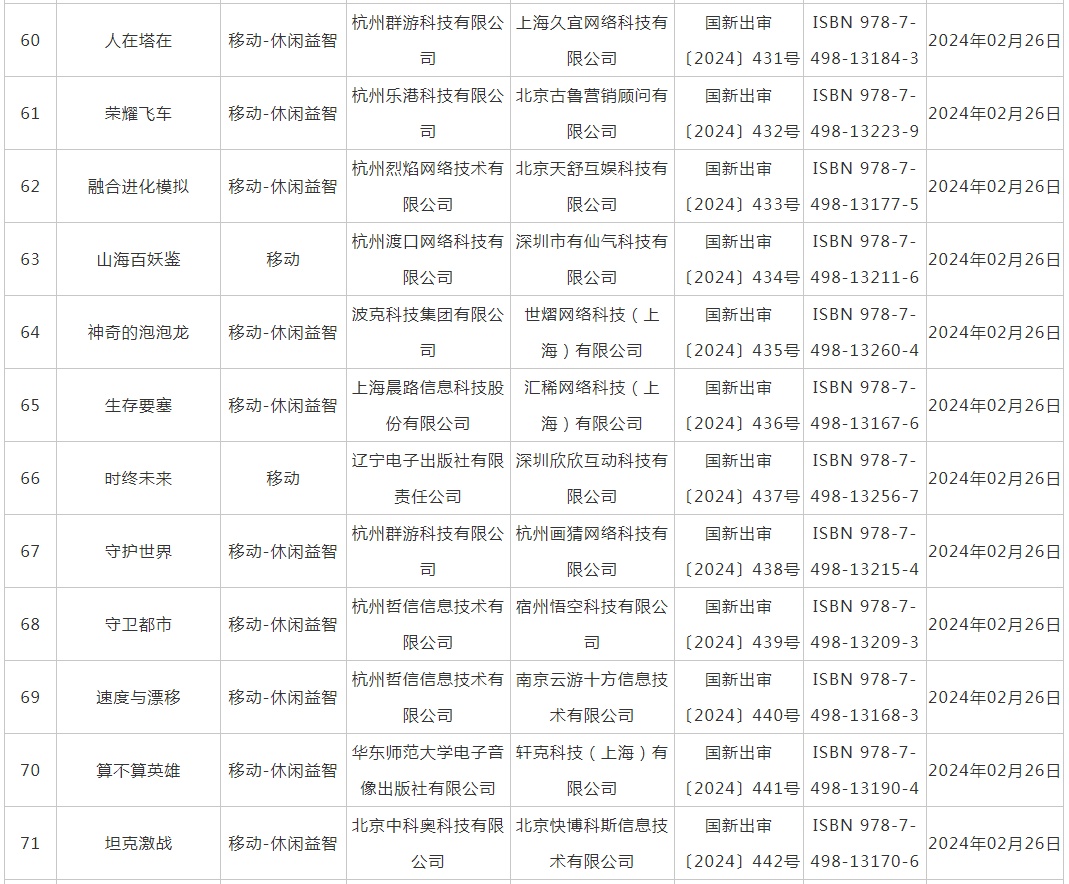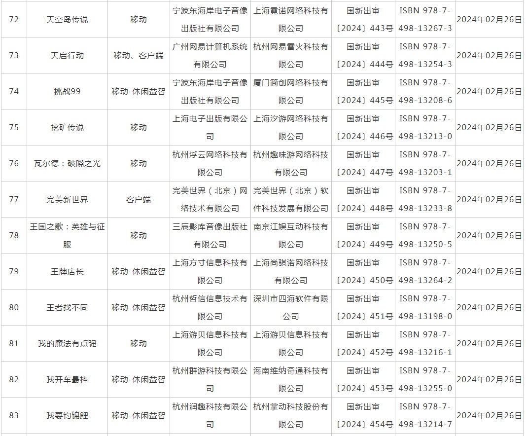 智通财经APP获悉,2月27日,国家新闻出版署发布2024年2月份国产网络游戏审批信息,共111款游戏获批。其中包括完美世界(002624.SZ)旗下的《完美新世界》、网易(09999)旗下的《天启行动》、中青宝(300052.SZ)旗下的《毕业之后》、《九州元意歌》、《梦境食旅》、《职场浮生记》等。