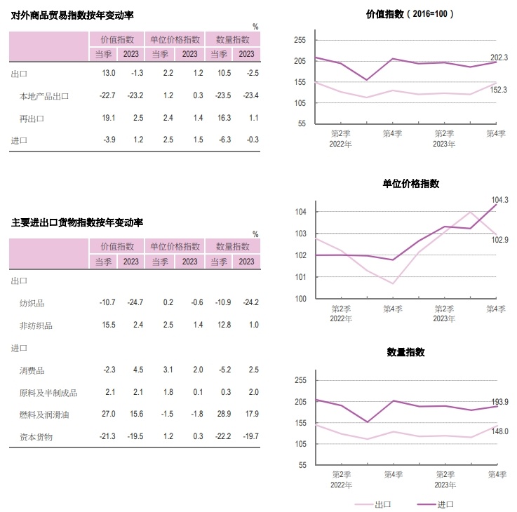 反映货物出口与进口价格比率的贸易价格比率指数,2023 年全年平均为 99.6,同比跌幅 0.2%;第 4 季指数同比下跌 0.2% 至 98.7。