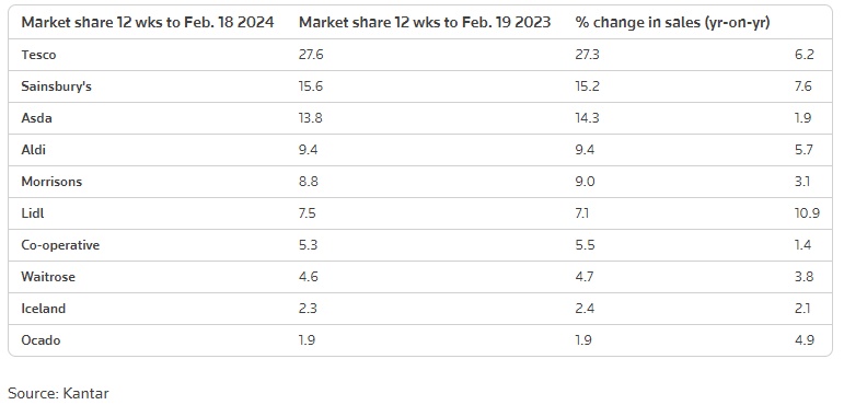 该机构表示,Lidl连续第六个月成为英国增长最快的杂货商,在截至2月18日的12周内,销售额增长了10.9%。Sainsbury's的增长速度第二快,销售额增长了7.6%,而市场领导者Tesco的销售额增长了6.2%。Asda和Morrisons再次落后,分别增长1.9%和3.1%。
