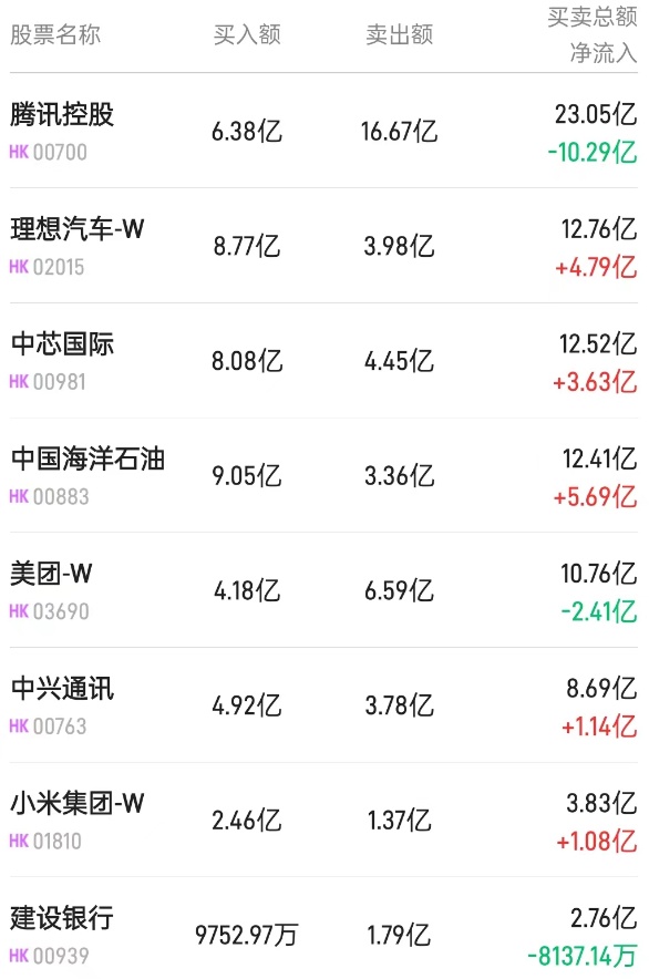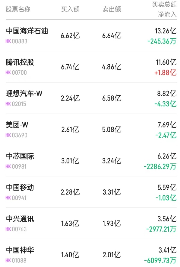 北水净买入最多的个股是中海油(00883)、中芯国际(00981)、新秀丽(01910)。北水净卖出最多的个股是腾讯(00700)、建设银行(00939)、中国移动(00941)。