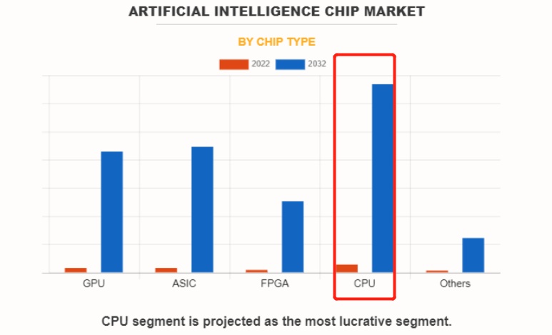 按照芯片大厂们的技术路线,PC、智能手机以及智能手表等应用端,AI芯片将以CPU为核心,集成NPU与GPU技术,这意味着消费电子芯片换代需求不久后将接力数据中心服务器芯片需求,迎来需求爆发。Allied Market Research预计,从芯片类型来看,以CPU为核心的应用终端AI芯片细分市场将在全球AI芯片市场中占据多数份额。