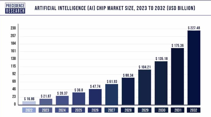 知名市场研究机构Precedence Research近期发布的AI芯片市场规模预测报告显示,预计到2032年涵盖CPU、GPU、ASIC以及FPGA等类型AI芯片市场规模将从2023年的约219亿美元激增至2274.8亿美元,2023-2032年复合增速接近30%。