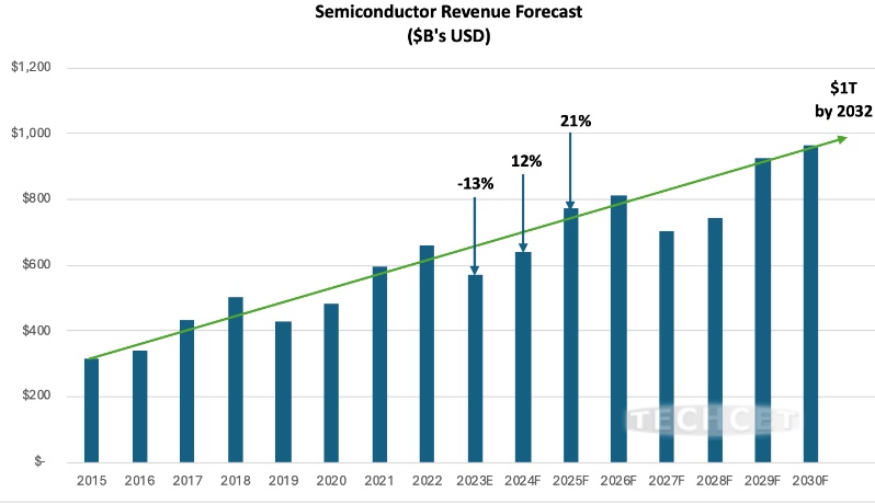 TECHCET预计 2024 年行业销售额有望大幅增长 12%,随后 2025 年将出现更强劲的增长,达到 21%。随着半导体市场在当年晚些时候因需求端议价能力提高以及芯片库存高企而进入需求下行周期,预计 2027-2028年,整个半导体市场销售额陷入调整,AI时代芯片产业链进入第一个基钦周期的下行期。但预计2028年下半年开始复苏,此后迅速进入下一轮基钦周期,TECHCET预计2031或2032年全球半导体市场规模有望突破万亿美元大关。