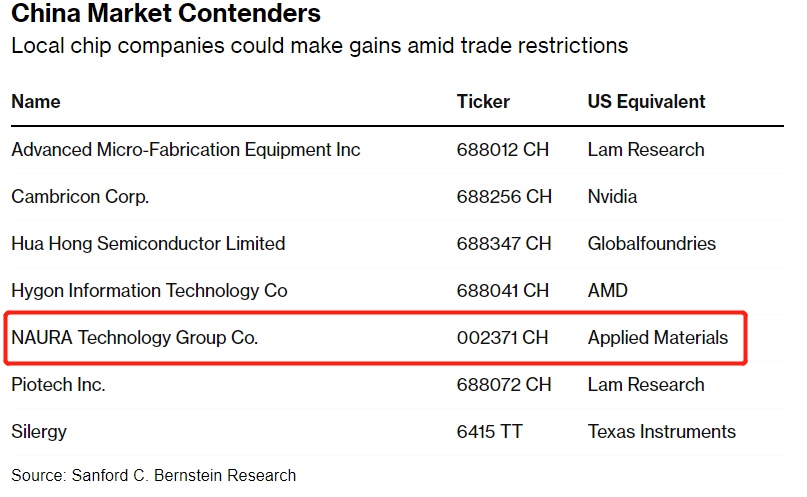 来自巴克莱银行(Barclays)和伯恩斯坦公司(Sanford C. Bernstein)的分析师们表示,Naura Technology Group(北方华创)等半导体设备公司的名字有一天可能将与应用材料以及LAM Research等美国半导体设备同行一样闻名全球。