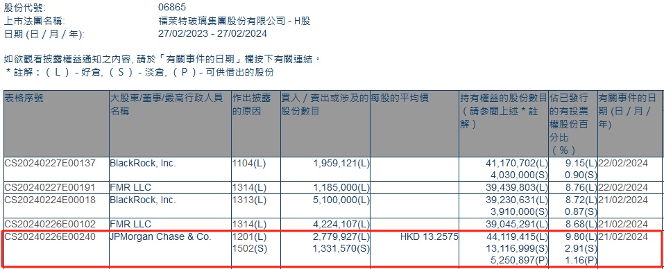 智通财经APP获悉,香港联交所最新资料显示,2月21日,小摩减持福莱特玻璃(06865)277.9927万股,每股作价13.2575港元,总金额约为3685.49万港元。减持后最新持股数目约为4411.94万股,最新持股比例为9.80%。
