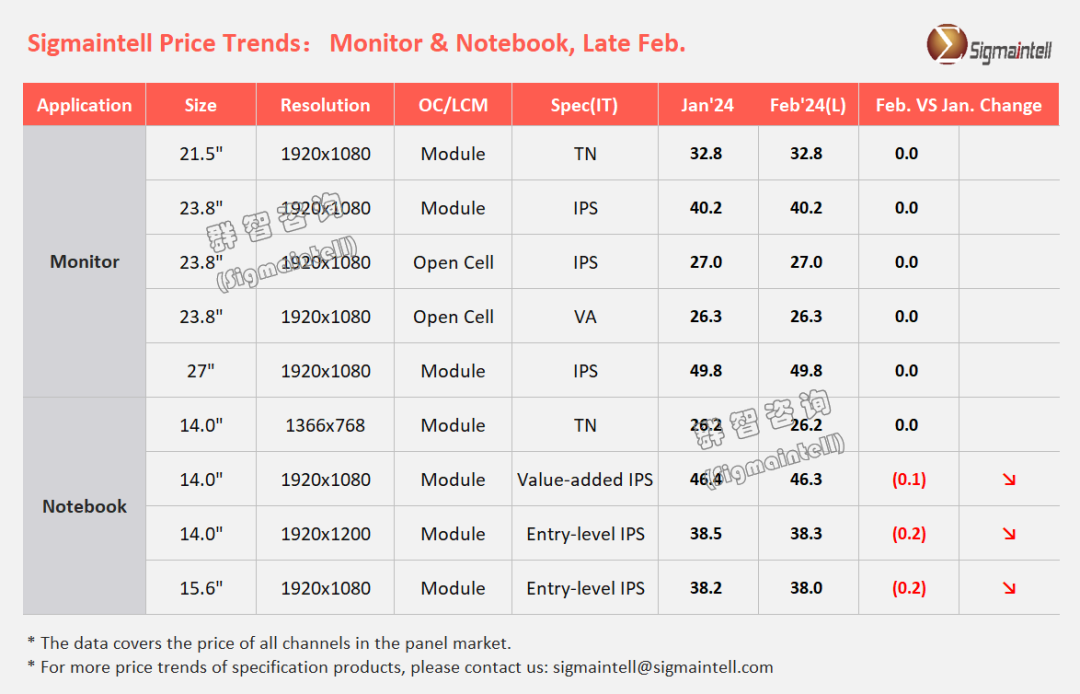 23.8"FHD,2月 Open cell和LCM保持稳定;