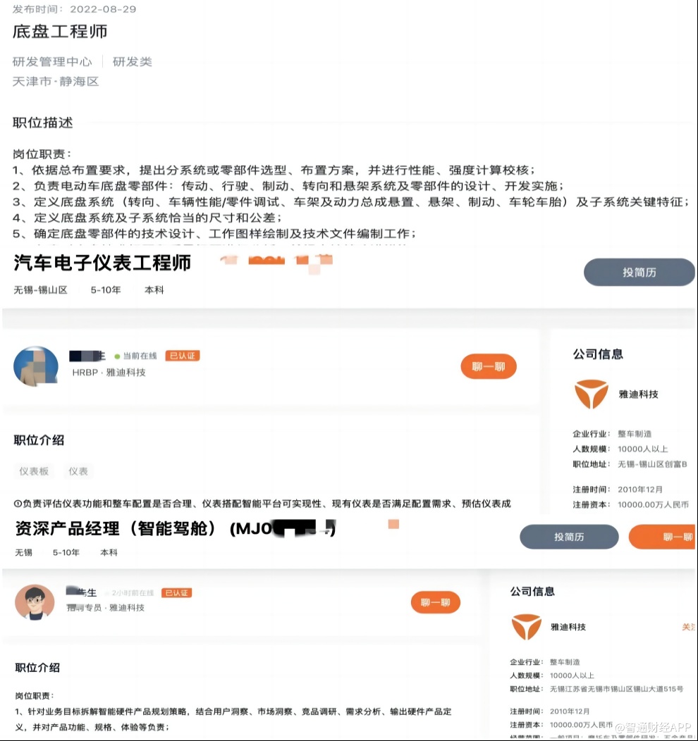 另外,招聘信息显示:雅迪正在招聘底盘工程师、智能座舱产品经理和汽车电子仪表工程师,进一步佐证了外界的猜测。
