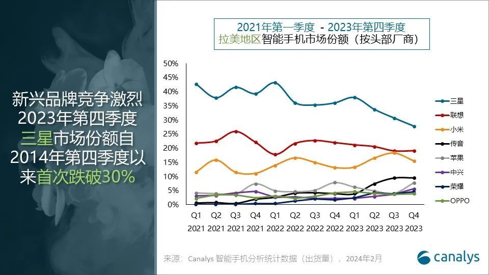 Pérez补充说:“除了头部厂商之外,其他厂商在推动2023年第四季度同比增长20%方面也功不可没。比如,小米等品牌加强与墨西哥和哥伦比亚运营商的联系,并重视在巴西和中美洲的扩张,助其保持了增长势头,实现42%的增长。在中美洲,加勒比海和厄瓜多尔等新兴市场中,传音旗下的 Infinix和 Tecno 品牌瞄准注重性价比的年轻消费者,实现 188% 的惊人增长。值得注意的是,苹果20%的同比增长主要得益于其在巴西和墨西哥出货的成功,这两个市场占iPhone 15系列出货量的85%。在前五名中,中兴和荣耀的出货量都实现三位数的增长。中兴恢复对其主要市场墨西哥的大量出货量,并扩张了在中美洲、加勒比海和秘鲁的业务。同时,荣耀在2023年延续了上个季度的增长势头,展示了强大的库存管理和针对运营商和主要零售商的重点渠道战略。”