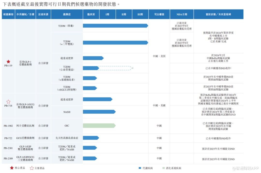 根据灼识咨询的资料,针对T2DM的单药疗法及联合疗法的临床结果为公司在中国就PB-119的NDA提供了支持,国家药监局已于2023年9月受理NDA,使PB-119跻身中国进度最领先的临床阶段长效GLP-1受体激动剂。公司预计最早于2024年第四季度获得NDA批准并于2025年在中国商业化推出用于治疗T2DM的PB-119。公司在美国完成了治疗T2DM的PB-119的II期临床试验。