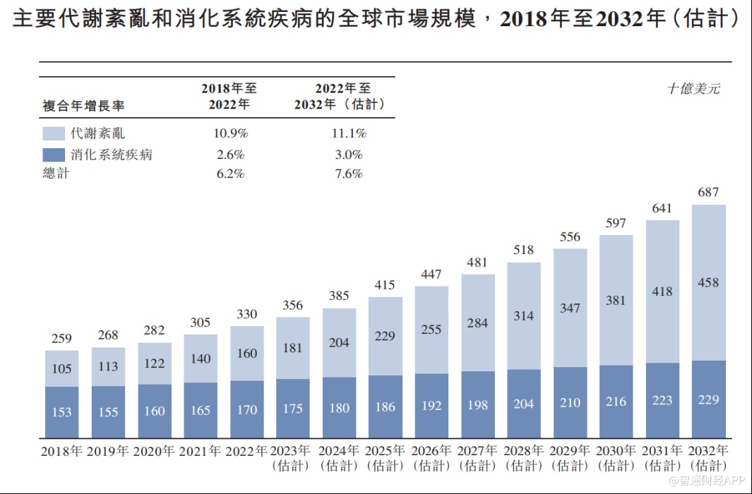 根据灼识咨询报告,于2022年,全球代谢紊乱和消化系统疾病的确诊病例约为48.51亿例,市场规模达到3300亿美元,行业2018年至2022年的复合年增长率为6.2%。预计到2032年,全球代谢紊乱和消化系统疾病的市场规模将达到6870亿美元,2022年至2032年的复合年增长率为7.6%。