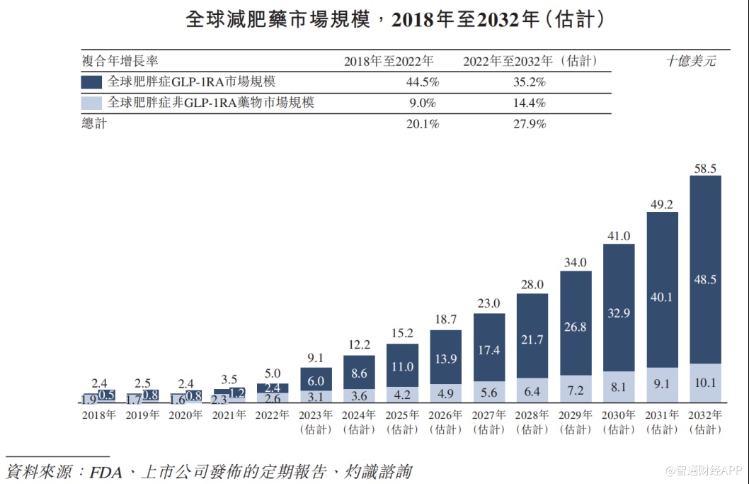 在代谢紊乱和消化系统疾病中,“降糖减肥”赛道市场广阔。以减肥药为例,灼识咨询报告显示,随着新型药物的不断开发及临床需求的不断增长,全球减肥药市场在过去几年中大幅扩张并有望加速增长。2018年至2022年,全球减肥药市场规模以20.1%的复合年增长率达到50亿美元,同期全球肥胖症GLP-1RA市场规模复合年增长率达到44.5%。预计2022年至2032年,全球减肥药市场规模将以20.9%的复合年增长率提升是585亿美元,其中肥胖症GLP-1RA药物市场规模的复合年增长率为35.2%。