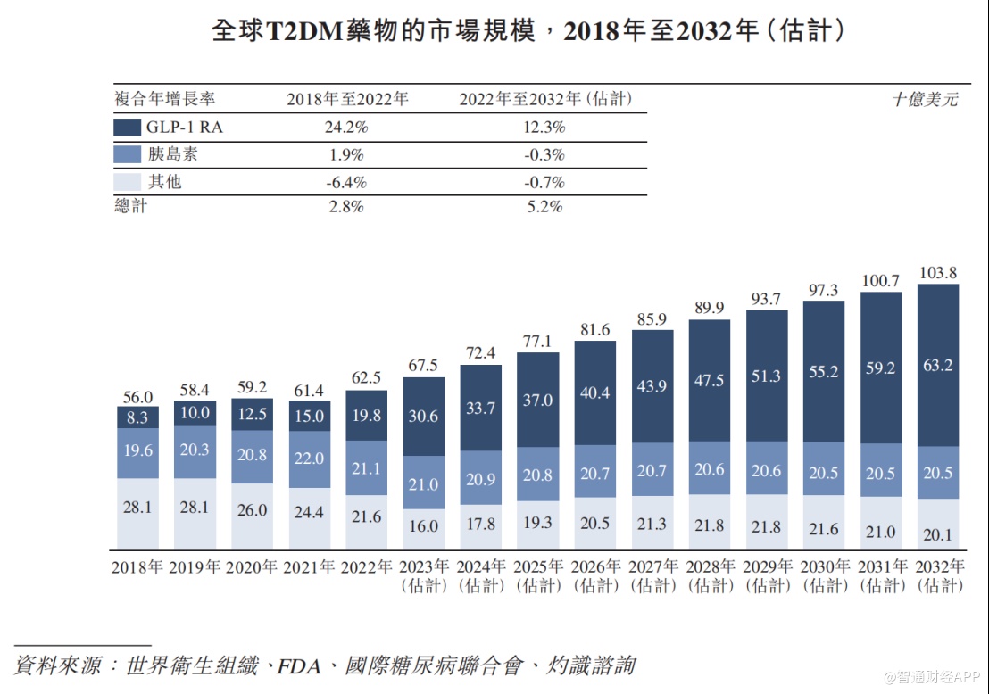 T2DM药物方面,2022年全球T2DM药物的市场规模达到625亿美元,预计2022年至2032年将以5.2%的复合年增长率提升1038亿美元。其中,GLP-RA药物的市场规模将在2032年达到632亿美元,2022年至2032年的复合年增长率为12.3%。
