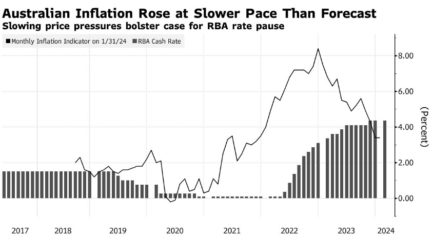 智通财经获悉,澳大利亚1月份消费者价格指数(CPI)维持在两年低点,打破了小幅上涨的预期,并强化了市场对利率无需进一步上调的预期。澳大利亚统计局周三公布的数据显示,1月份CPI同比上涨3.4%,与去年12月持平,低于市场预期的3.6%。