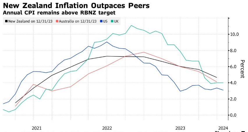 新西兰联储在退出疫情时期的刺激措施方面走在了其他央行的前列,它一直在努力遏制通胀,自2021年10月以来将利率上调了525个基点,这是自1999年引入官方现金利率以来最激进的紧缩政策。加息大幅放缓了经济,最近的数据显示,经济增速低于央行此前的预期。然而,与预期的4.2%相比,2023年第四季度的失业率略好于4.0%。