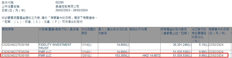 智通财经APP获悉,香港联交所最新资料显示,2月22日,FMR LLC减持泉峰控股(02285)15.33万股,每股作价14.6672港元,总金额约为224.85万港元。减持后最新持股数目约为5103.55万股,最新持股比例为9.99%。
