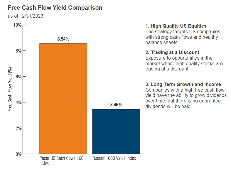 Pacer ETFs官网显示,截至2023年12月31日,自由现金流收益率高达8.54%,大幅超越美股价值股基准之一——罗素1000价值指数的收益率。